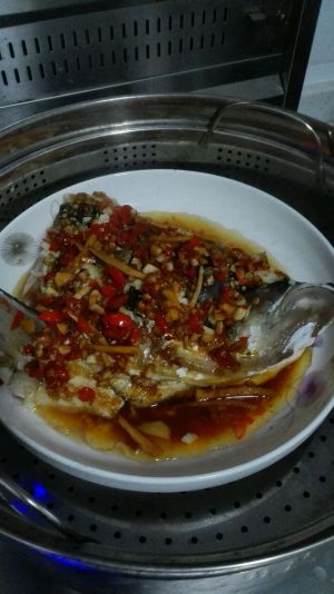 锅内烧水,开后放入放好剁椒的鱼头蒸8分钟左右!