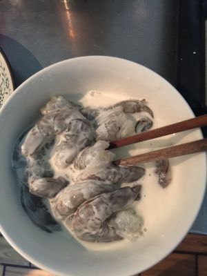 用盐醋水清洗干净,去头,去腮帮,去肠线,背部剪开。沥干水备用。