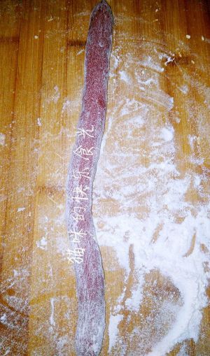 取白色面团,用擀面棒擀开,包裹住红色面团。