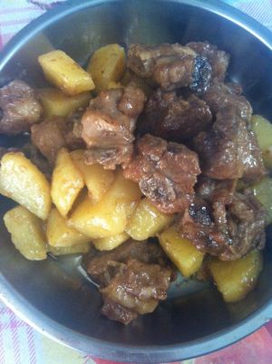 排骨洗净冷水下锅,煮出血沫捞出冲净。 砂锅里倒少许油,(保持中火)油热放八角和姜片,20秒后放冰糖搅拌融化,放葱段煸炒出味放排骨,用筷子翻拌几下,倒入料酒、生抽、老抽,翻拌均匀加水沒过排骨,加入炖肉料,盖上盖子煮沸转小火慢炖。十分钟左右翻拌一次(均匀入味和避免沾锅)。20分钟后放盐拌匀再煮10分钟左右关火焖10分钟。有点啰嗦,但却是我失败多次后总结出来的,学起来做给爱你或是你爱的人吃吧。n(*≧▽≦*)n
