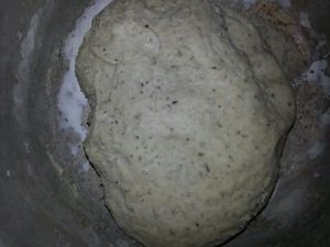 面粉加酵母,白糖,分次加入黑芝麻粥和成面团,放在温暖的地方等待发酵。