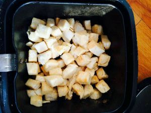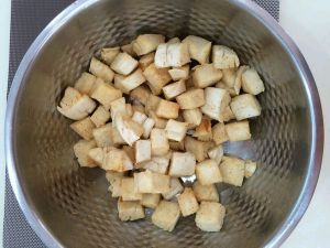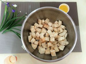 把切好的馒头放在盆中,加入麻辣鲜,搅拌均匀。