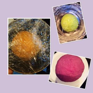 分别将这三种蔬菜加入面粉,酵母粉,白糖进行搅拌,其中紫薯内加50ml牛奶。(南瓜放凉再加酵母粉,每份蔬菜内加2克酵母粉)