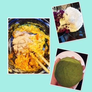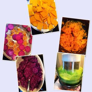 南瓜去皮去瓤切片,紫薯去皮切片。放蒸锅上蒸烂,捣成泥……青菜叶加水榨汁备用……