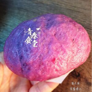 紫薯去皮蒸熟!捣碎!放另一份面粉进行发酵!