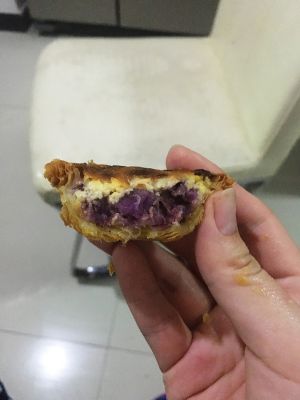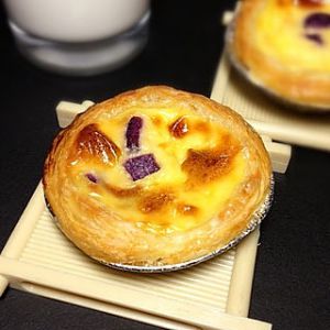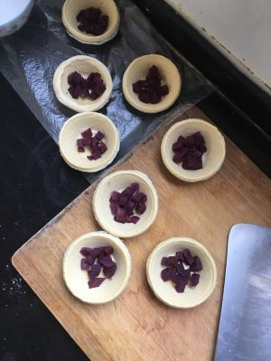 将蒸好的紫薯放入挞皮中,8到9分满。