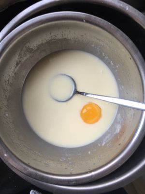 准备好食材,把鸡蛋白糖一起打散然后加入纯牛奶搅拌均匀过筛