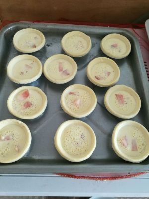 桃子切小丁,放入蛋挞皮,每个两小块就可以,然后把调好的蛋挞液用勺子盛进去,别太满
