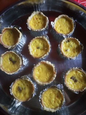 把葡萄干放进挞皮里再加入挞水,烤箱上下火230度预热十分钟,然后把蛋挞放进去烤20分钟就可以出炉啦!特别好吃哦!很脆!