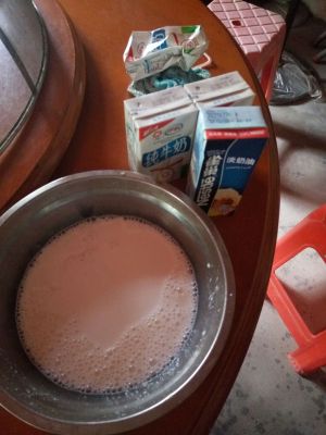 把鸡蛋跟糖放在一个碗里, 把牛奶和煮熟磨碎的红豆放在一个碗里,分两个碗来装。 接着分开均匀搅拌到完全混合为止, 接着把红豆与牛奶混合后的液体慢慢倒进鸡蛋里。最终就会和图片的感觉一样就行了!