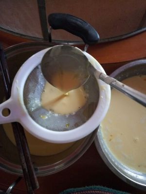 拿另一个锅把挞水过筛,这样挞水就做好啦