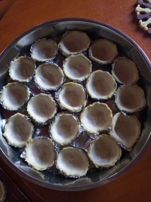 把所有挞皮按好了都先脱模放一旁待用哦!这是要放进烤箱的时候再装入模具的样子,得在按一按哦!