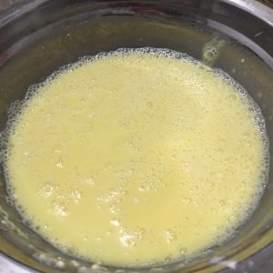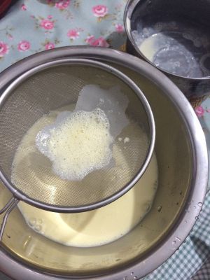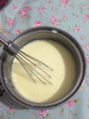 将玉米淀粉筛入放凉的奶液中,边放边搅拌直到没有颗粒,这就是挞液了,要过筛一到二次,不过也可以
