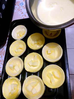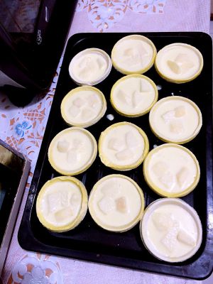 把提前泡过盐水的苹果丁放在挞皮里,倒入蛋挞水。