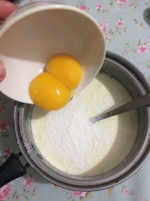 冷却后,加入蛋黄和低筋面粉,搅拌均匀。