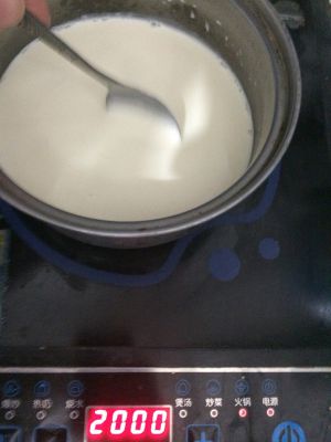 牛奶加入奶锅内,加入20克白糖小火加热,加热的过程不停搅拌,直到糖融化