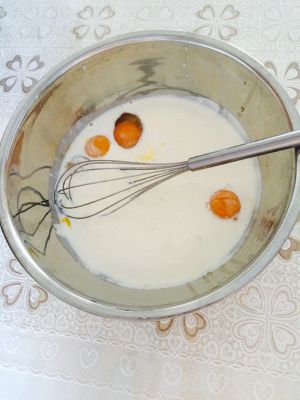 鸡蛋敲在容器中,手动打蛋器打散,加入牛奶搅拌均匀,再加入糖粉继续手动打蛋器搅拌均匀。