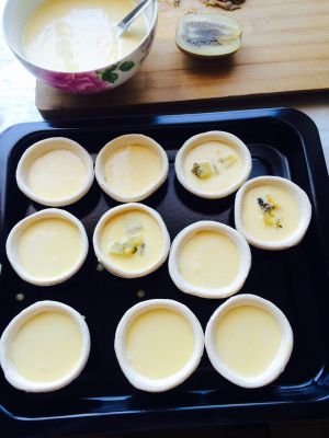 放在全部的蛋挞壳里。八分满。可以放喜欢的水果。