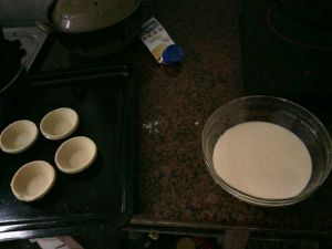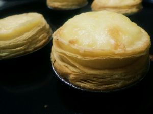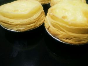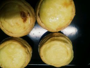 烤箱预热,中层190度烤15分钟至蛋挞鼓起后,再200度烤1到2分钟至上色即可。