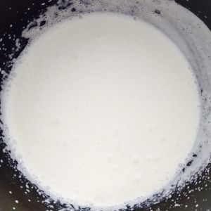 将82克奶油,82克牛奶放入不沾锅,用打蛋器低档(1-3)打2分钟,打匀,细砂糖倒一半打一分钟。切换高档(6-7)把奶液打发变稠状2分钟左右。会膨胀1.5-2倍。