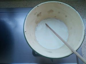 牛奶,淡奶油微热,加糖化开,放凉,加入面粉,蛋黄,拌匀