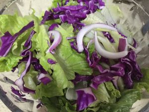 生菜 紫甘蓝 洋葱切好 加橄榄油 色拉酱 生磨胡椒粉 拌匀