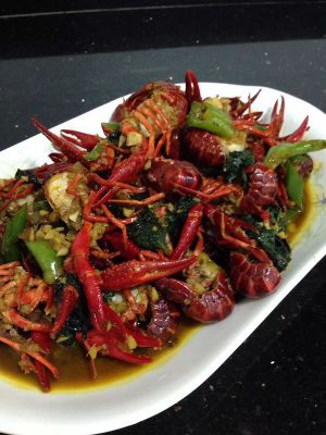 先放油下锅把辣椒和蒜爆香再把龙虾放进去炒一会再放适量老酒,酱油,海天蚝油炒十分钟就可以出锅了。