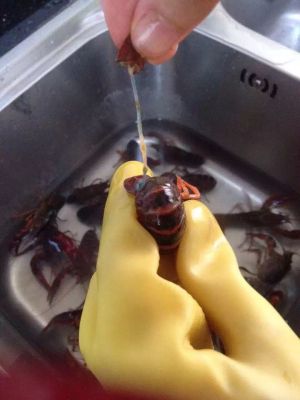 用剪刀在小龙虾的眼睛后处剪去沙囊,留下虾黄可以放心享用