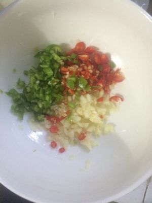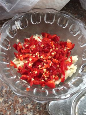 辣椒和蒜瓣剁碎备用。