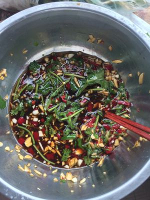 在盆里倒入大量味极鲜生抽,香醋和芝麻油,加上一把香菜。各个调料比例可以按个人口味来添加。