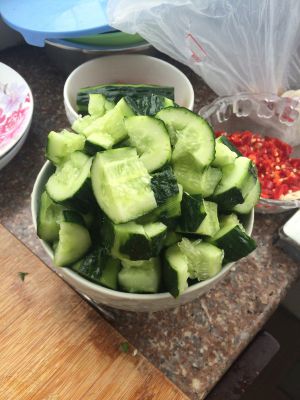 黄瓜洗净破边,拍几下然后切块放入盛器