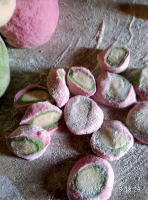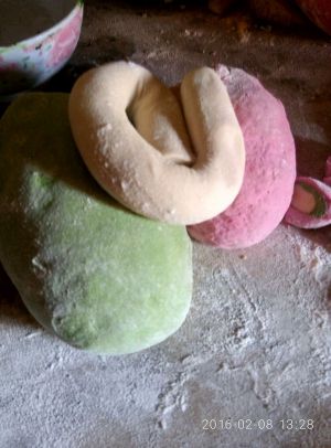 中间揉一个白面的细条,把绿色面擀成长片包住白面,红色的面擀成长片包住绿色面就成了。
