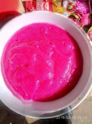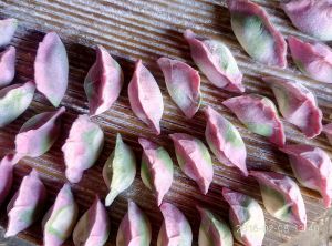 把打碎的菠菜和火龙果分别放入面粉揉成面块。