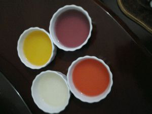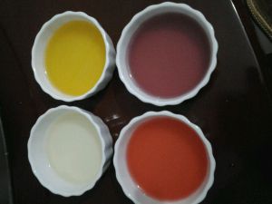 把QQ糖放碗里隔水加热融化,一种颜色差不多放十颗。然后加入一口量的牛奶,均匀搅拌,倒入布丁杯。