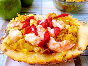 将炒好的米饭,盛入菠萝锅内,大功告成