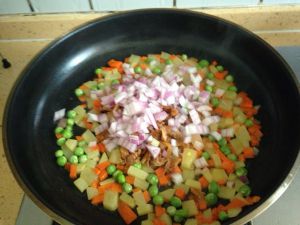 炒白米饭锅中再倒入油,放入葱花、放入米饭,用锅铲轻轻将米饭压散,倒入炒好的鸡蛋,和沥干的菠萝丁