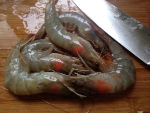 把虾去头去皮去虾线、用盐和黑胡椒腌制5分钟…
