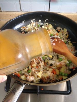 放入泰国香米,炒至均匀,依次放入盐,鱼露,酱油上色…