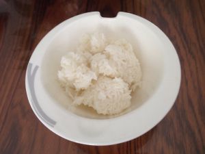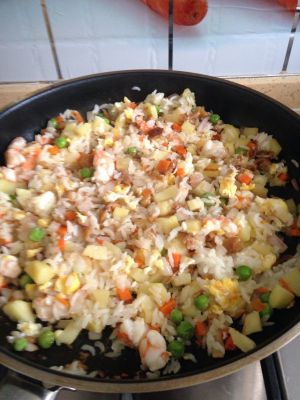 等到米饭好了盛出一碗 把菠萝肉倒进去搅拌均匀
