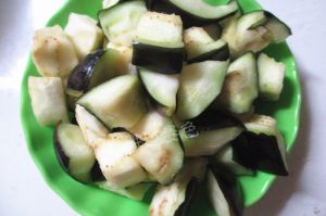 往茄子块中放一小勺盐拌匀,然后腌十分钟。