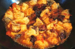 加入木耳翻炒至断生,再入茄子翻炒,加入适量生抽 老抽 蚝油 糖,酌情加盐