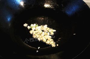 起一只干净的锅,倒入少量的油。油热的时候,蒜末煸炒出香味。