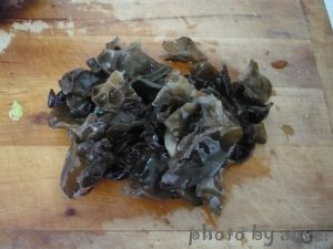 已泡发好的黑木耳用右手抓出两把用刀稍微切小段控水备用