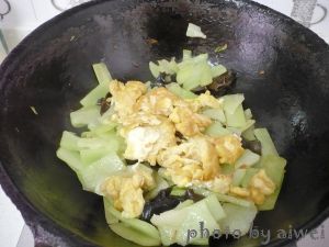 锅放油,入葱花,放黑木耳翻炒2分钟,放黄瓜片再翻炒,最后把炒好的鸡蛋放入,加盐、鸡精调味,出锅装盘