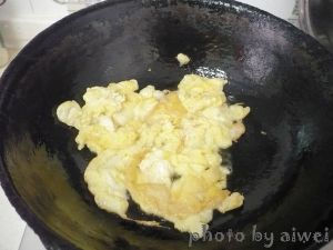 锅中倒入油,5分热后加入打好的鸡蛋翻炒,变黄后捞出