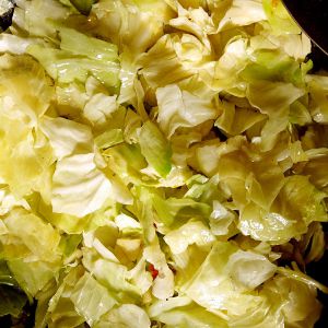 加入包菜炒至软,加一勺生抽,一勺耗油,少许盐,少许黑胡椒炒均匀就可以出锅了。
