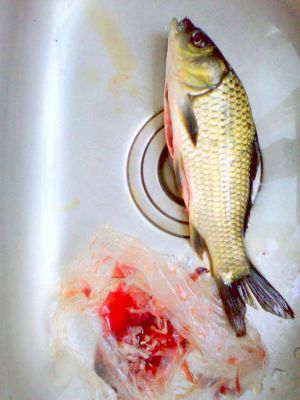 将鱼清洗干净,去除鱼腥线,葱姜蒜切片,一般的葱姜蒜放入鲫鱼肚子内部