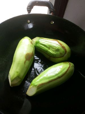 锅中放少许油,小火。放入洗净的茄子(去蒂,不去皮)待底部变软之后翻个,直至茄子全熟。