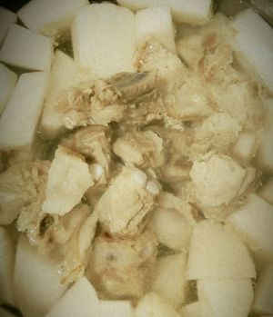 白萝卜跟排骨一起放入锅里再加蒜姜橘子皮即可开始炖