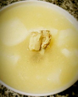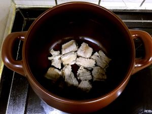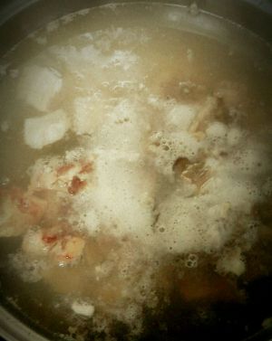 汤锅烧热,倒入炒好的排骨姜片,加上足量清水,滴2滴白醋。
